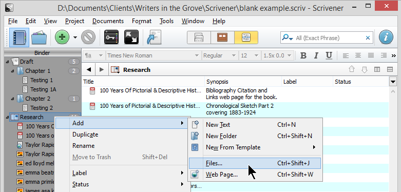 Scrivener – Research – Add files to Research Binder – Lorelle VanFossen