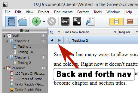 Scrivener – Navigation Arrows go back and forth along doc view path
