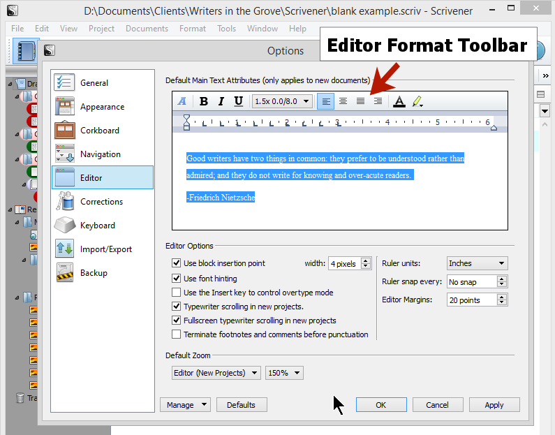 Scrivener – Options – Editor – Interface – Lorelle