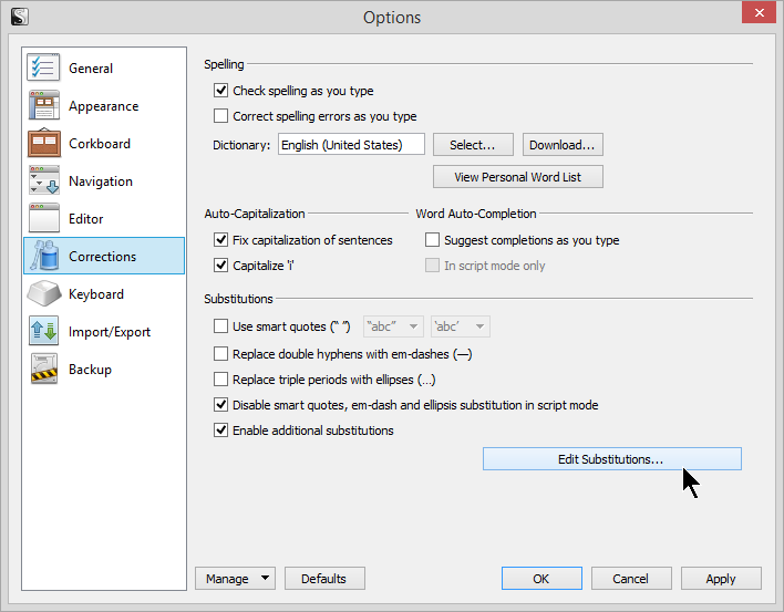 Scrivener – Options – Corrections – Edit Substitutions – Lorelle