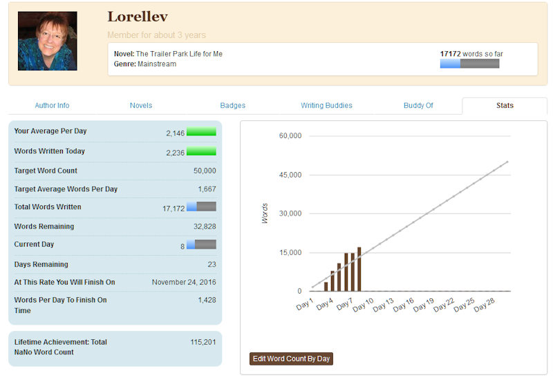 NaNoWriMo Dashboard with Word Count and Statistics Chart.